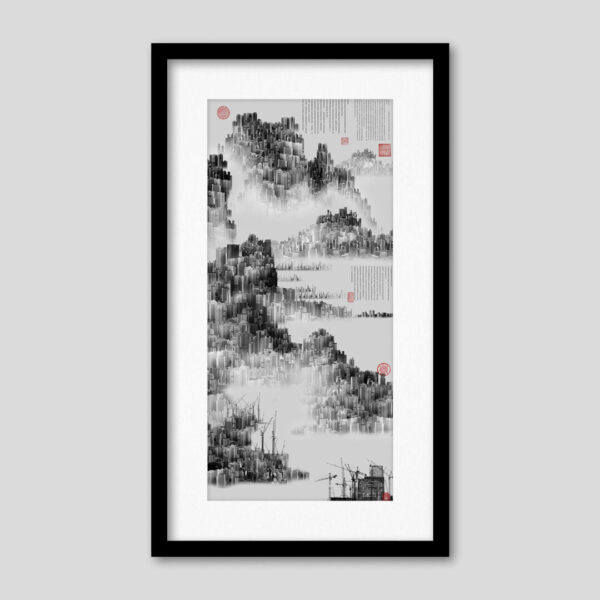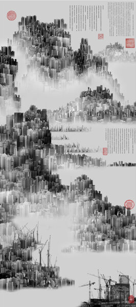 На первый взгляд «полотна» автора напоминают традиционную китайскую пейзажную живопись, но при ближайшем рассмотрении становится заметно – то, что издалека казалось горой – становится нагромождением многоэтажных зданий, а то, что было деревом – оказывается обилием строительных кранов. Автор конструирует свои туманные пейзажи из фотографий современных китайских городов, переосмысляя наследие китайской культуры. Полотна, которые когда-то давно увековечивали красоту природы Китая, сегодня отражают его будущий пейзаж. Работы Юнляна – это антиутопии, которые в скором времени могут стать реальностью.